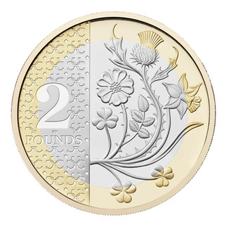 The largest of the UK’s definitive coins features flowers and plants that represent the four countries of the United Kingdom – a rose for England, a daffodil for Wales, a thistle for Scotland and a shamrock for Northern Ireland."