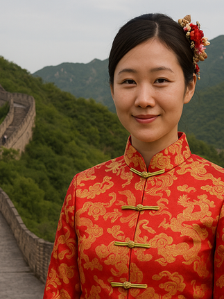 CHINA - "A Chinese woman dressed in a traditional red and gold qipao standing on the Great Wall of China, with lush green mountains and a watchtower stretching into the distance."